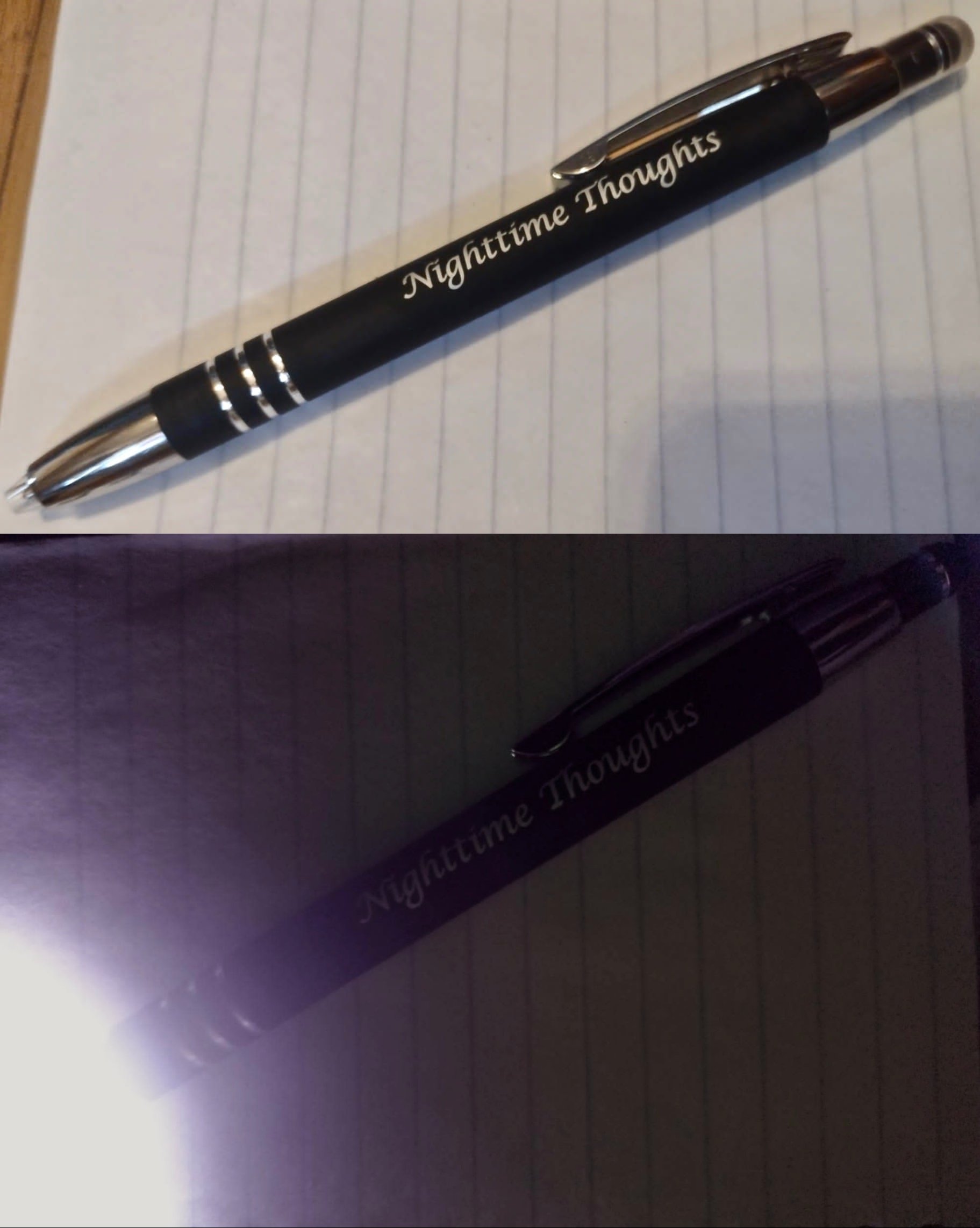 The Nighttime Thoughts pen is a pen with a light-up tip, to keep on your bed-side table. Humans seem to do our best thinking as soon as we get in bed and put our head on the pillow. That’s when we think of things we need to do the next day, which we often think we’ll still remember in the morning, but we hardly ever do. It’s when we get ideas for stories we want to write. But we don’t feel like getting back up out of bed to find a pen. And we don’t want to turn on a lamp and disturb anyone else who might be sleeping in the room. How many ideas have been lost forever because people thought they would still remember them in the morning, didn’t want to get out of bed again, didn’t have a pen by the bed, and didn’t want to turn on a lamp? You might think “but I keep my smartphone on my bed-side table. I can just type things into that.” However, for numerous reasons relating to mental and physical health, it is not a good idea to keep your smartphone near you while you sleep. “But my smartphone is my alarm clock!” BUY AN ALARM CLOCK. And get a Nighttime Thoughts pen.
